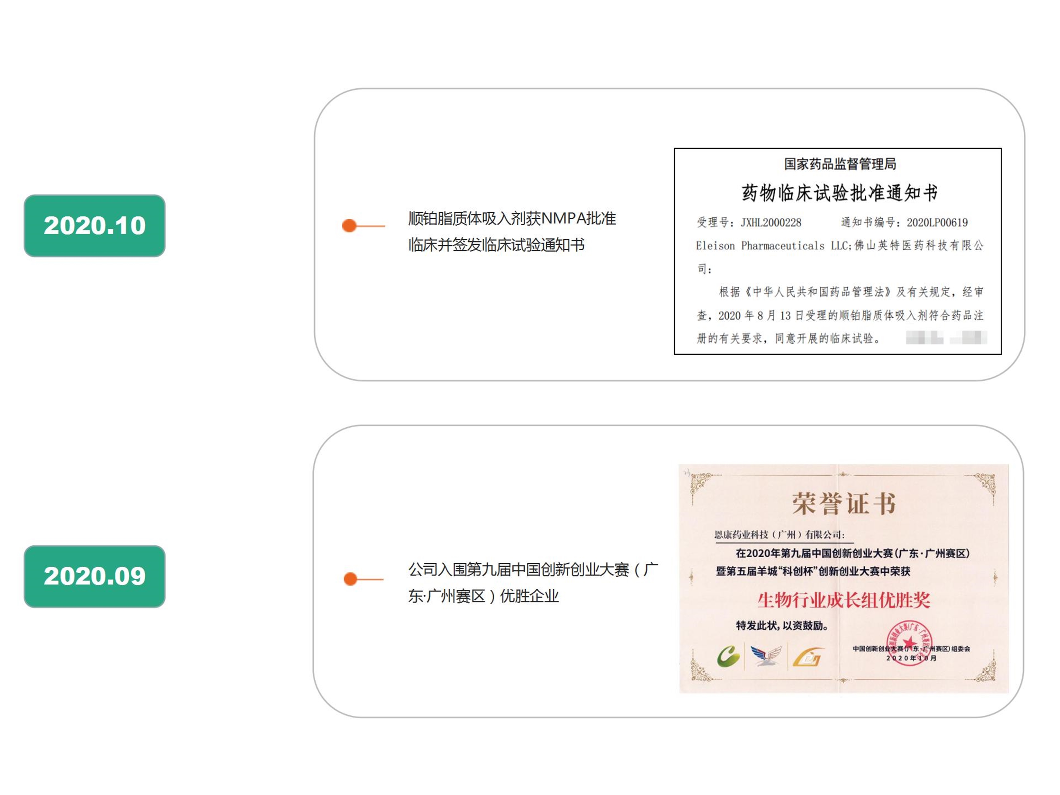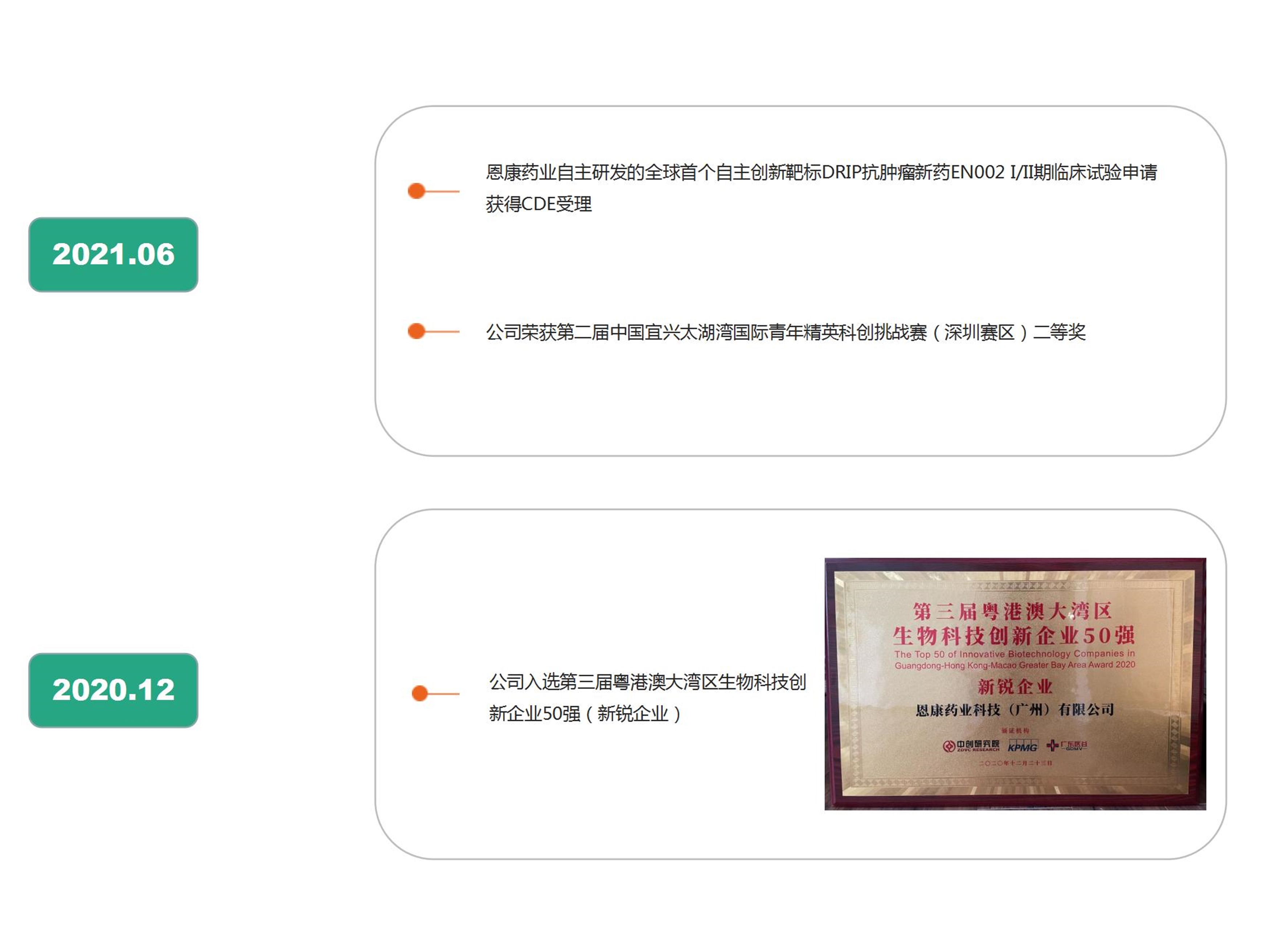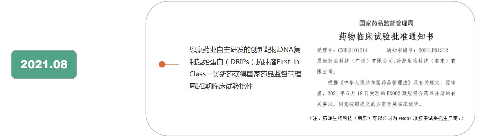 恩康药业以世界首创的高选择性新靶标-DNA 复制起始蛋白(DRIPs)-抗癌药物筛选技术为核心,致力于靶向DRIPs 的原研小分子及核酸抗癌药物的研发,已申请国内外发明专利30余项,其中授权11项。公司首个创新DRIPs抑制剂First-in-Class一类抗癌药物EN002凝胶已完成临床前研究,于2021年8月获得用于治疗非黑色素瘤皮肤癌及癌前病变的中国I/II 期临床批件,目前已完成以中国和澳洲为主的国际多中心I期临床研究,II期临床研究正在积极启动中。另外,公司与美国Eleison药业签订合作协议,共同开发吸入型脂质体顺铂 (Inhaled Lipid Cisplatin; ILC) 用于肺部肿瘤的治疗,于2021年11月获得美国FDA的III期临床许可,并于2022年2月获得中国III期临床批件,公司正在启动该III期临床研究。公司拥有吸入型脂质体药物的制备工艺核心技术,致力ILC和其它治疗肺部疾病药物的脂质体新剂型的研发,已申请相关专利14项。