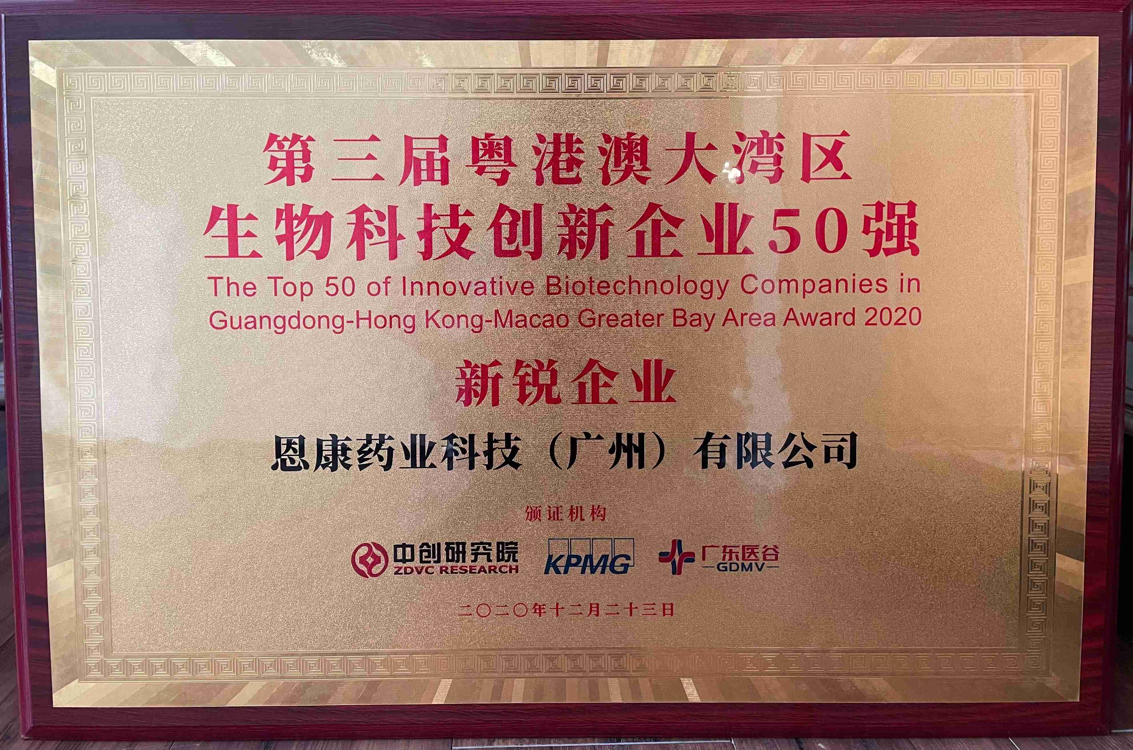 榜单,荣获“第三届粤港澳大湾区生物科技创新企业50强-新锐企业”称号。