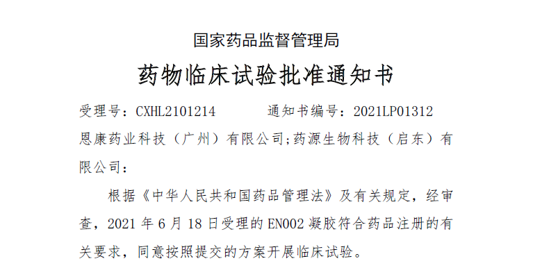 (注:药源生物科技(启东)有限公司为EN002凝胶中试委托生产商。)