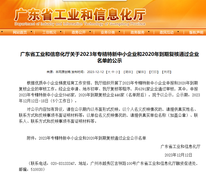 2023年12月12日,根据优质中小企业梯度培育工作安排,广东省工业和信息化厅组织开展了2023年专精特新中小企业申报工作。经过多轮严格筛选审核,恩康药业科技(广州)有限公司成功入选,荣获2023年“专精特新”企业的荣誉称号。